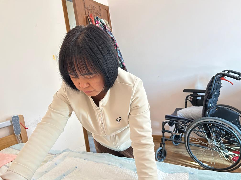 舒云娣為白叟收拾床展。(受訪者供圖)