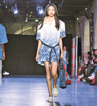 模特在法國巴黎古裝周上展現黎錦元素服裝。新華社記者 高 靜攝